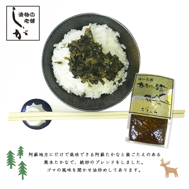 そのまま暖かいご飯に混ぜ込んで、阿蘇名物 ”たかな飯”が簡単にできます。